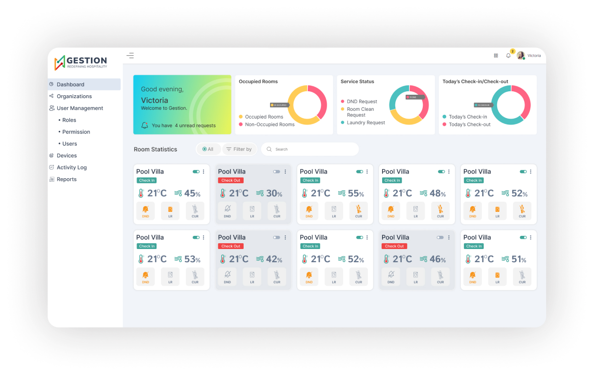 - Remote access and control: Access and control systems remotely, enabling efficient management and quick response to guest requests or system issues.